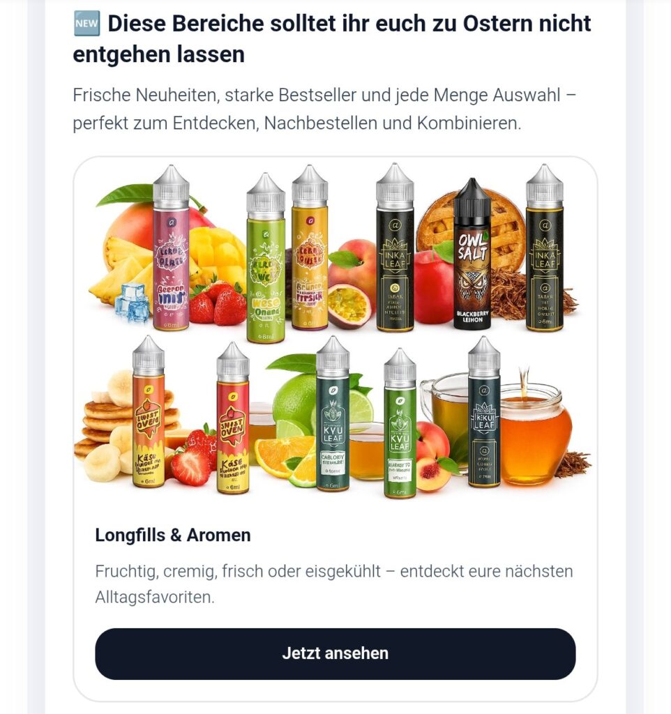 Ostern ist da – und damit eure Chance, euch eure Favoriten und spannende Neuheiten zu besonders starken Konditionen zu sichern. Egal ob ihr auf der Suche nach frischen Longfills, kräftigen Nikotinsalz-Liquids, zuverlässigen Pod-Systemen oder einem neuen Starterset seid: